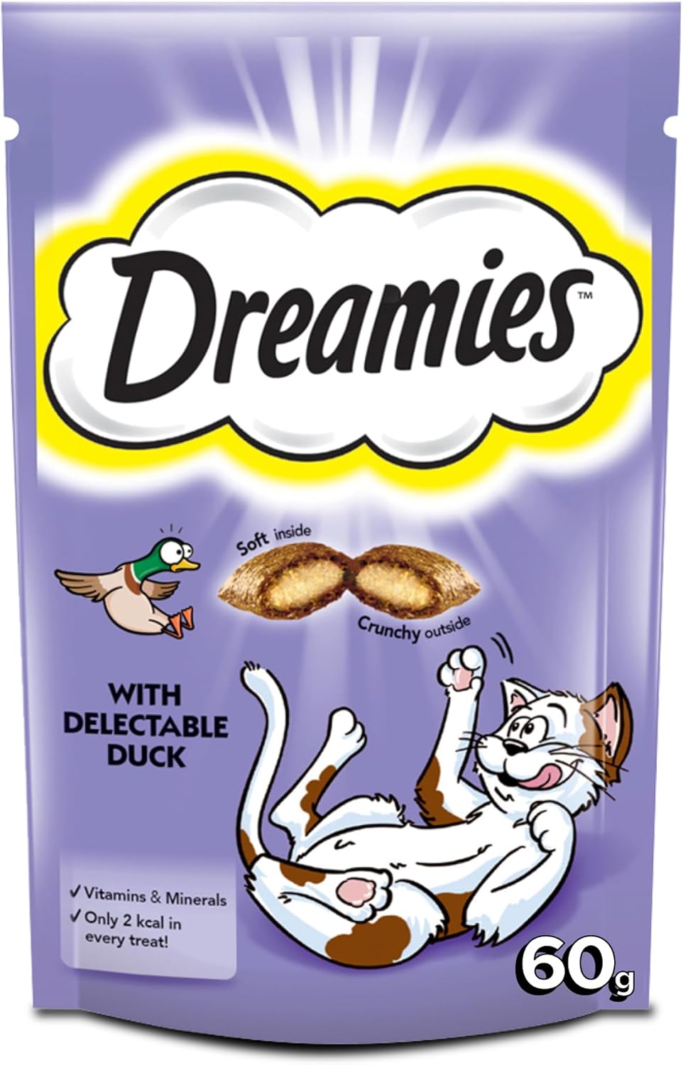 مكافآت القطط دريميز بنكهة البط اللذيذ، 60 جرامًا، مقرمشة من الخارج، طرية من الداخل، مكافأة القطط بنكهة البط