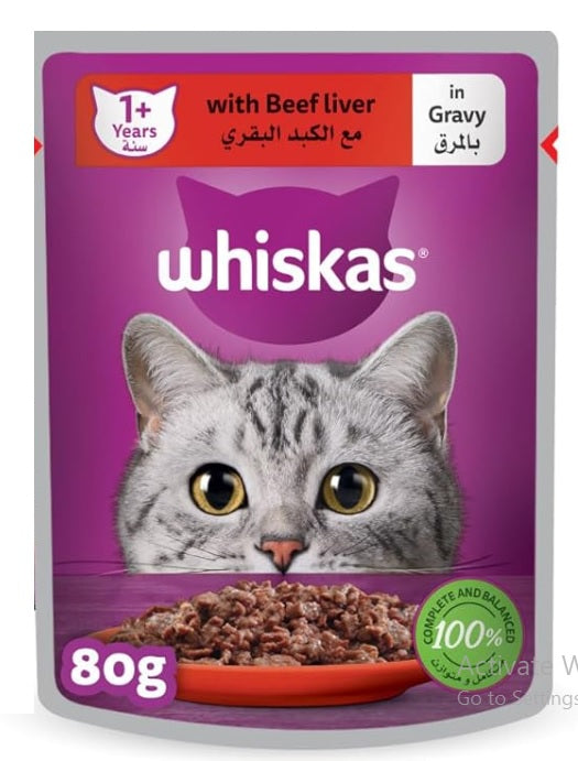 طعام القطط الرطب من ويسكاس، كبد بقري في مرق، عبوة من قطعة واحدة 80 جم، طعام رطب للقطط البالغة من عمر سنة فما فوق، تغذية كاملة ومتوازنة