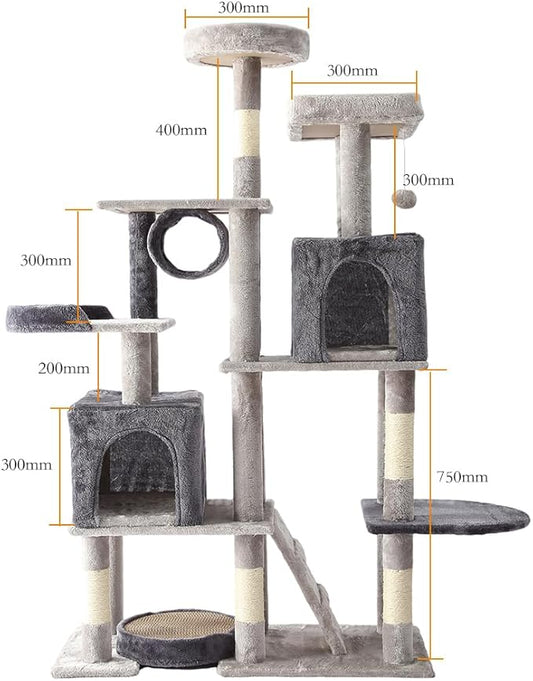 برج قطط كبير، شجرة قطط داخلية مع أعمدة التقاط مغطاة بالسيزال وكرات التقاط مخملية، مناسب للقطط الصغيرة والمتوسطة الحجم (رمادي، 90 * 40 * 165)