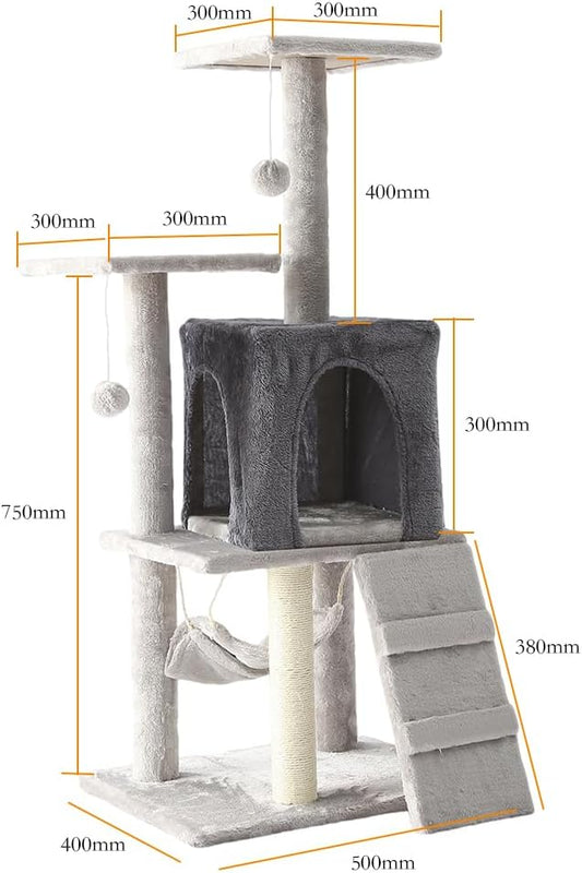 برج القطط، شجرة قطط داخلية مع أعمدة التقاط مغطاة بالسيزال وكرات التقاط مخملية، مناسبة للقطط الصغيرة والمتوسطة الحجم (رمادي، 50 * 40 * 110 مع أرجوحة)