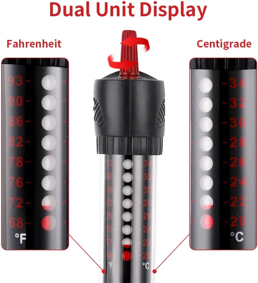 - 🐠【سهل الاستخدام】يمكنك استخدام كوبي الشفط لتثبيت قضيب التسخين وإخفائه بسهولة في حوض السمك. يوجد مؤشران لدرجة الحرارة على قضيب التسخين، مما يتيح لك معرفة درجة الحرارة في أي وقت داخل الحوض. يمكنك ضبط درجة الحرارة باستخدام مقبض التحكم في درجة الحرارة الأحمر في الأعلى.