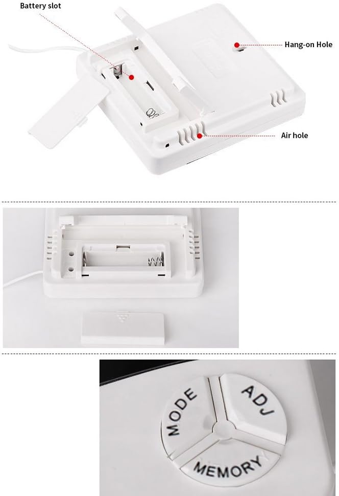 - 💕 وظيفة المفتاح: (الوضع) التبديل، وضع عرض الساعة والتنبيه / ضبط الوقت الحالي، المنبه، نظام 12 أو 24 / ساعة، التاريخ: (ضبط) ضبط قيمة العنصر المراد ضبطه؛ (الذاكرة) عرض أعلى وأدنى قيمة لدرجة الحرارة والرطوبة في الذاكرة / مسح أعلى وأدنى قيمة لدرجة الحرارة والرطوبة في الذاكرة؛ (° C / ° F) تبديل عرض وحدة درجة الحرارة (° C) أو (° f).